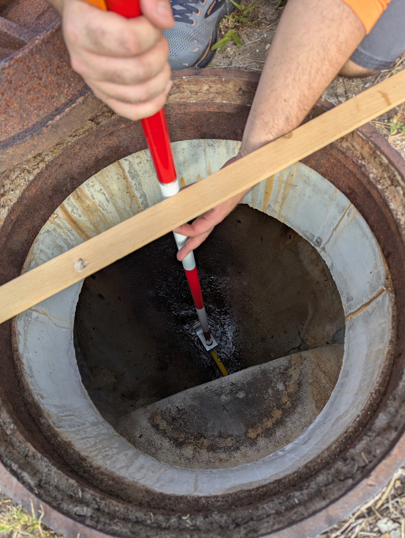 To get a pipe measure, first get the pipe invert measure, then push the rod tip upward towards the inside upper lip and measure. ( "pipe invert depth" - "upper pipe lip depth" = "pipe size" )